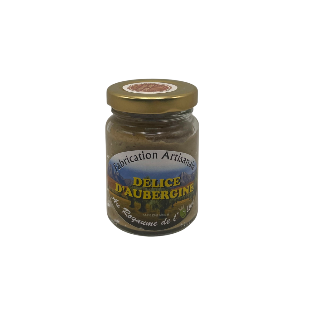 Délice d’aubergine, en pot de 90 g. Onctueux et savoureux, il révèle toute la richesse des saveurs méditerranéennes pour vos apéritifs et recettes