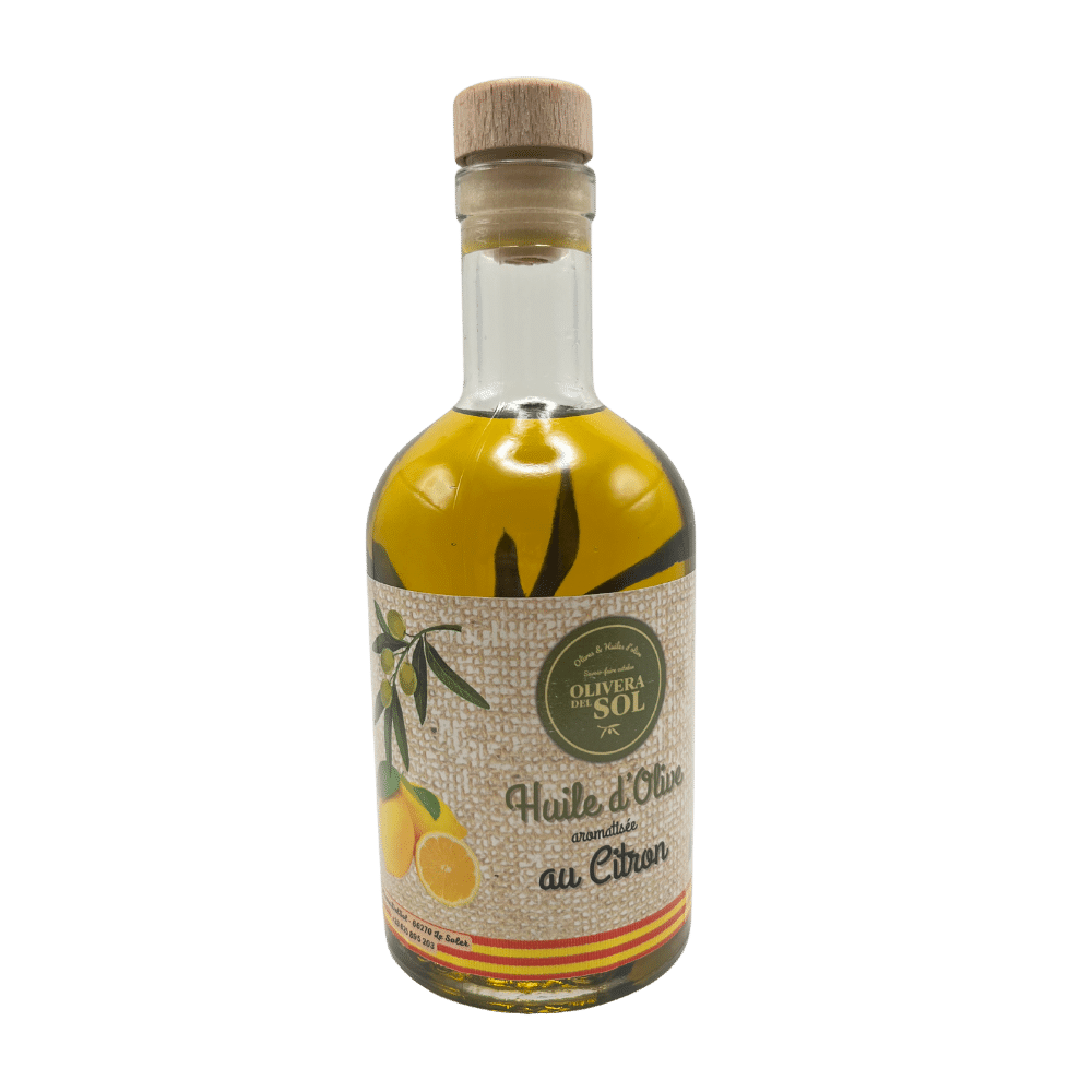 Huile d’olive extra vierge parfumée au citron, en bouteille de 35 cl. Fraîche et ensoleillée, elle apporte une touche acidulée et méditerranéenne à vos plats.